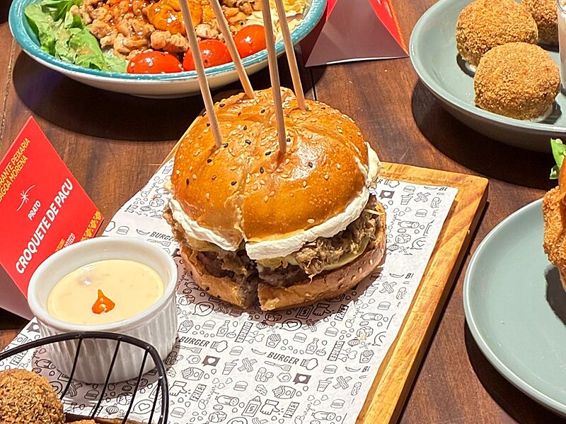 Beiju de mandioca Recheado com carne seca desfiada, pimenta biquinho, banana da terra,salsinha fresca e requeijão cremoso. Finalizado com queijo parmesão gratinado no maçarico e cebolinha